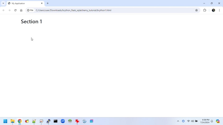 You can start every Brython front-end project with that generic boilerplate code. All this code does is load the Brython environment and some 'Bootstrap' styling files to make your app look nice, and it sets up a basic screen layout. Save the file to your desktop then click the icon for 'brython1.html', to open it in your web browser. Right now, the application code doesn't do anything except display 'My Application' in the browser tab, and 'Section 1' on the screen.