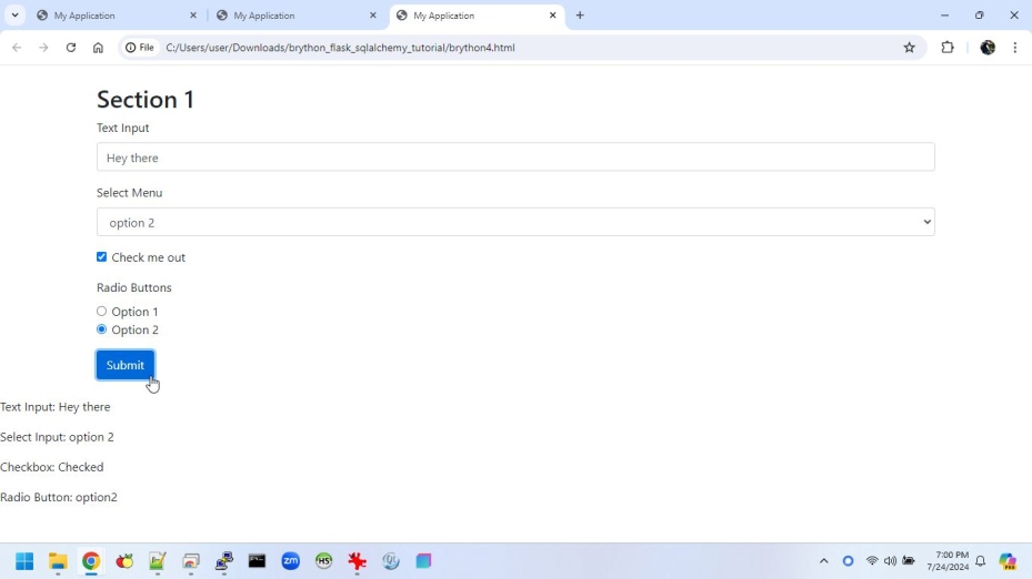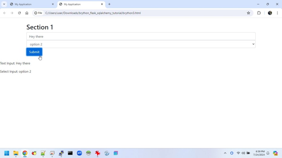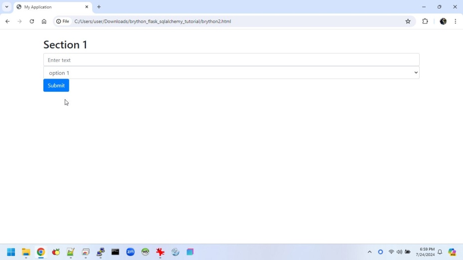 <!DOCTYPE html> <html lang="en"> <head> <meta charset="UTF-8"> <meta name="viewport" content="width=device-width, initial-scale=1.0"> <title>My Application</title> <link href="https://stackpath.bootstrapcdn.com/bootstrap/4.5.2/css/bootstrap.min.css" rel="stylesheet"> <script type="text/javascript" src="https://cdn.jsdelivr.net/npm/brython@3.11.0/brython.min.js"></script> <script type="text/javascript" src="https://cdn.jsdelivr.net/npm/brython@3.11.0/brython_stdlib.js"></script> </head> <body onload="brython()"> <div class="container mt-4"> <h2>Section 1</h2> </div> <div class="container mt-4"> <form id="exampleForm"> <input type="text" class="form-control" id="textInput" placeholder="Enter text"> <select class="form-control" id="selectInput"> <option>option 1</option> <option>option 2</option> <option>option 3</option> </select> <button type="button" class="btn btn-primary" id="submitButton">Submit</button> </form> </div> <div id="output" class="mt-4"></div> <script type="text/python"> from browser import document, html def handle_submit(event): text_input = document["textInput"].value select_input = document["selectInput"].value output = document["output"] output.clear() output <= html.P(f"Text Input: {text_input}") output <= html.P(f"Select Input: {select_input}") document["submitButton"].bind("click", handle_submit) </script> </body> </html>