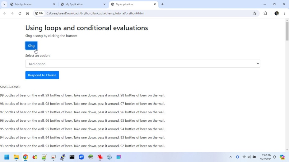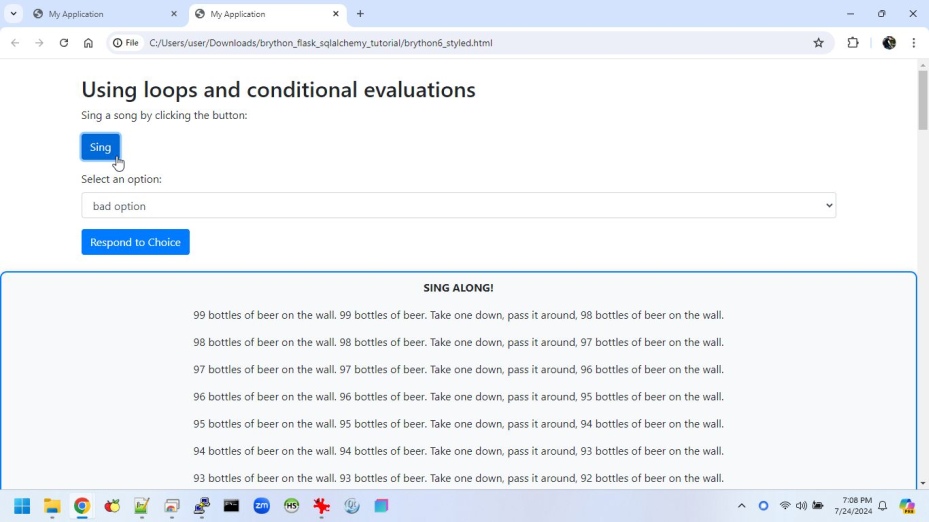 <!DOCTYPE html> <html lang="en"> <head> <meta charset="UTF-8"> <meta name="viewport" content="width=device-width, initial-scale=1.0"> <title>My Application</title> <link href="https://stackpath.bootstrapcdn.com/bootstrap/4.5.2/css/bootstrap.min.css" rel="stylesheet"> <script type="text/javascript" src="https://cdn.jsdelivr.net/npm/brython@3.11.0/brython.min.js"></script> <script type="text/javascript" src="https://cdn.jsdelivr.net/npm/brython@3.11.0/brython_stdlib.js"></script> </head> <body onload="brython()"> <div class="container mt-4"> <h2>Using loops and conditional evaluations</h2> <form id="singForm"> <div class="form-group"> <p>Sing a song by clicking the button:</p> </div> <button type="button" class="btn btn-primary" id="singButton">Sing</button> </form> <p></p> <form id="choicesForm"> <div class="form-group"> <label for="selectInput">Select an option:</label> <select class="form-control" id="selectInput"> <option>bad option</option> <option>good option</option> </select> </div> <button type="button" class="btn btn-primary" id="choiceButton">Respond to Choice</button> </form> </div> <div id="output" class="mt-4"></div> <script type="text/python"> from browser import document, html def handle_sing(event): output = document["output"] output.clear() output <= html.P("SING ALONG!") for counter in range(99, 0, -1): output <= html.P( f"""{counter} bottles of beer on the wall. {counter} bottles of beer. Take one down, pass it around, {counter - 1} bottles of beer on the wall.""" ) def handle_choice(event): select_input = document["selectInput"].value output = document["output"] output.clear() if select_input == 'good option': output <= html.P('You\'ve made a great choice.') else: output <= html.P('You\'ve made a horrible choice.') document["singButton"].bind("click", handle_sing) document["choiceButton"].bind("click", handle_choice) </script> </body> </html>