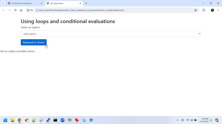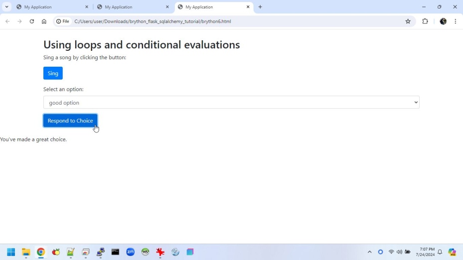 <!DOCTYPE html> <html lang="en"> <head> <meta charset="UTF-8"> <meta name="viewport" content="width=device-width, initial-scale=1.0"> <title>My Application</title> <link href="https://stackpath.bootstrapcdn.com/bootstrap/4.5.2/css/bootstrap.min.css" rel="stylesheet"> <script type="text/javascript" src="https://cdn.jsdelivr.net/npm/brython@3.11.0/brython.min.js"></script> <script type="text/javascript" src="https://cdn.jsdelivr.net/npm/brython@3.11.0/brython_stdlib.js"></script> </head> <body onload="brython()"> <div class="container mt-4"> <h2>Using loops and conditional evaluations</h2> <form id="choicesForm"> <div class="form-group"> <label for="selectInput">Select an option:</label> <select class="form-control" id="selectInput"> <option>bad option</option> <option>good option</option> </select> </div> <button type="button" class="btn btn-primary" id="choiceButton">Respond to Choice</button> </form> </div> <div id="output" class="mt-4"></div> <script type="text/python"> from browser import document, html def handle_choice(event): select_input = document["selectInput"].value output = document["output"] output.clear() if select_input == 'good option': output <= html.P('You\'ve made a great choice.') else: output <= html.P('You\'ve made a horrible choice.') document["choiceButton"].bind("click", handle_choice) </script> </body> </html>