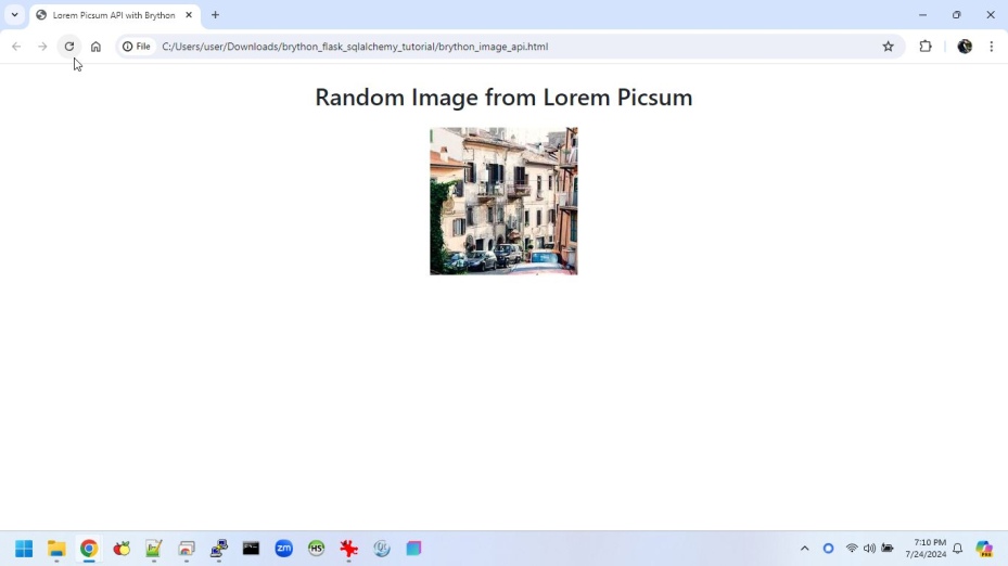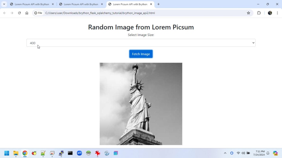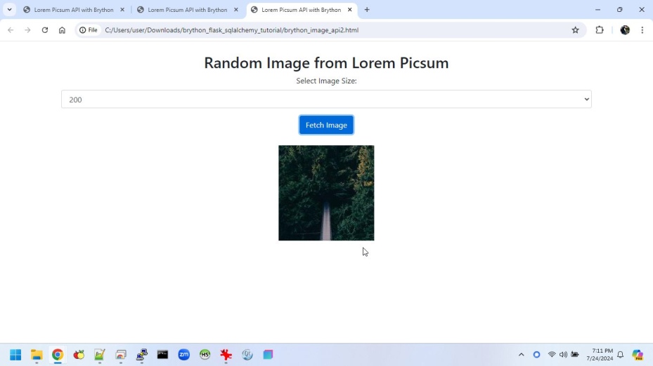 Now try changing the URL to https://picsum.photos/400 , and then https://picsum.photos/800 . You'll see that by changing the number at the end of the URL path, the size of the returned image changes. We can incorporate images from that API into a Brython app. Save this code as 'brython_image_api.html', and run in your browser: