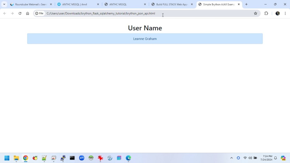 - The Brython script section fetches the JSON data from the REST API we created in Flask, and displays it in the 'output' div. The fetch_data function makes an AJAX request to http://127.0.0.1:5000/data and calls on_complete when the request completes.