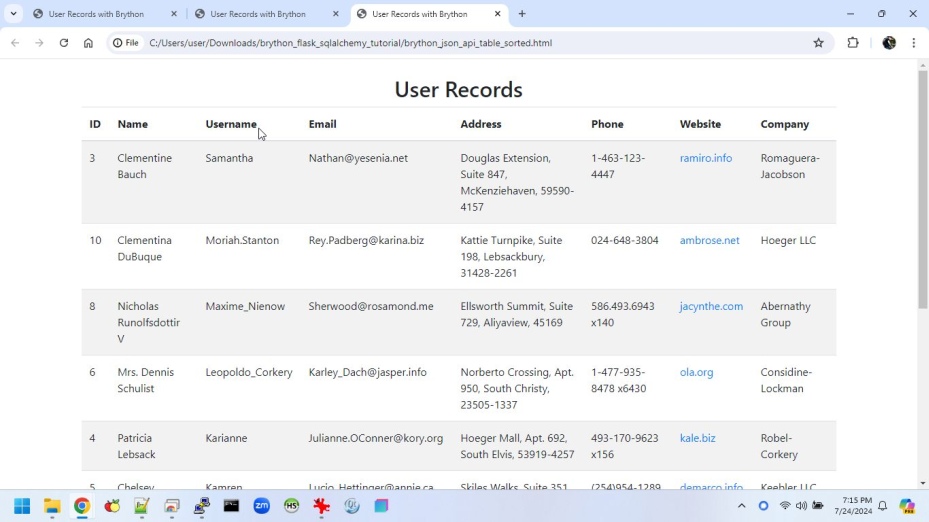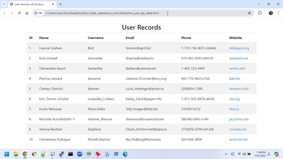 This next example extends what we've done above, to populate a table widget with the data from the ten records at the API above. The table header (the 'thead' tag), contain 6 columns, which are populated using a 'for' loop in the populate_table table function. Save this code to a file named 'brython_json_api_table.html' and run it in your browser: