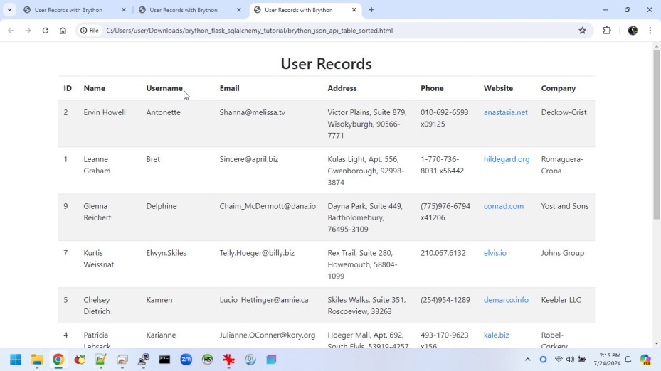 <!DOCTYPE html> <html lang="en"> <head> <meta charset="UTF-8"> <meta name="viewport" content="width=device-width, initial-scale=1.0"> <title>User Records with Brython</title> <link href="https://stackpath.bootstrapcdn.com/bootstrap/4.5.2/css/bootstrap.min.css" rel="stylesheet"> <script type="text/javascript" src="https://cdn.jsdelivr.net/npm/brython@3.11.0/brython.min.js"></script> <script type="text/javascript" src="https://cdn.jsdelivr.net/npm/brython@3.11.0/brython_stdlib.js"></script> </head> <body onload="brython()"> <div class="container mt-4"> <h2 class="text-center">User Records</h2> <table class="table table-striped" id="dataTable"> <thead> <tr> <th id="header-id">ID</th> <th id="header-name">Name</th> <th id="header-username">Username</th> <th id="header-email">Email</th> <th id="header-address">Address</th> <th id="header-phone">Phone</th> <th id="header-website">Website</th> <th id="header-company">Company</th> </tr> </thead> <tbody id="table-body"> <!-- Data will be populated here by Brython --> </tbody> </table> </div> <script type="text/python"> from browser import document, ajax # Global variable to hold the fetched users users = [] # Function to fetch data from the API def fetch_data(): def on_complete(req): global users if req.status == 200: users = req.json populate_table(users) ajax.get('https://jsonplaceholder.typicode.com/users', oncomplete=on_complete) # Function to populate the table with data def populate_table(data): table_body = document['table-body'] table_body.innerHTML = '' for user in data: address = f"""{user['address']['street']}, {user['address']['suite']}, {user['address']['city']}, {user['address']['zipcode']}""" company = user['company']['name'] row = f""" <tr> <td>{user['id']}</td> <td>{user['name']}</td> <td>{user['username']}</td> <td>{user['email']}</td> <td>{address}</td> <td>{user['phone']}</td> <td><a href="http://{user['website']}" target="_blank">{user['website']}</a></td> <td>{company}</td> </tr> """ table_body.innerHTML += row # Function to sort the table data def sort_table(column, reverse=False): sorted_data = sorted(users, key=lambda x: x[column], reverse=reverse) populate_table(sorted_data) # Function to initialize sorting functionality def initialize_sorting(): sort_state = {} def toggle_sort(event, col): current_order = sort_state.get(col, False) sort_table(col, not current_order) sort_state[col] = not current_order for column in ['id', 'name', 'username', 'email', 'address', 'phone', 'website', 'company']: document[f'header-{column}'].bind('click', lambda event, col=column: toggle_sort(event, col)) # Fetch data when the page loads fetch_data() initialize_sorting() </script> </body> </html>