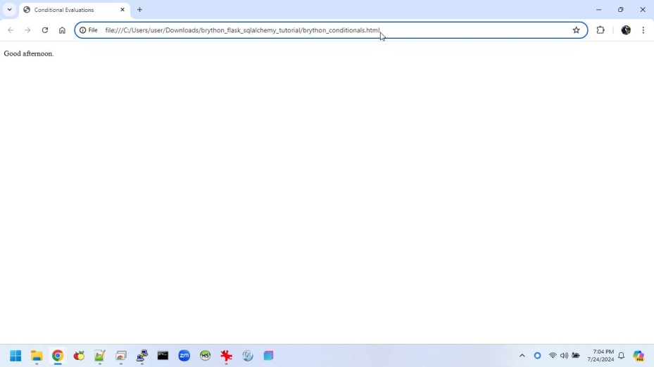 <!DOCTYPE html> <html lang="en"> <head> <meta charset="UTF-8"> <meta name="viewport" content="width=device-width, initial-scale=1.0"> <title>Conditional Evaluations</title> <script type="text/javascript" src="https://cdn.jsdelivr.net/npm/brython@3.11.0/brython.min.js"></script> <script type="text/javascript" src="https://cdn.jsdelivr.net/npm/brython@3.11.0/brython_stdlib.js"></script> </head> <body onload="brython()"> <div id="output"></div> <script type="text/python"> from browser import document, html from datetime import datetime, time output = document["output"] current_time = datetime.now().time() if current_time < time(12, 0): output <= html.P('Good morning.') else: output <= html.P('Good afternoon.') </script> </body> </html>