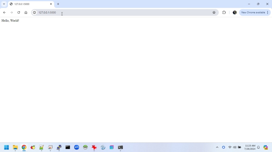 python flask1.pyThen open your browser to the URL below, and you'll see the "Hello, World!" message: