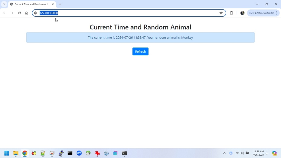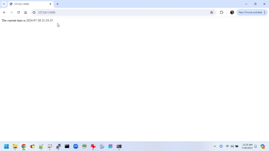 python flask2.pyThen open your browser to URL below, and you'll see the current time. Refresh the page a few times, and you'll see the displayed time change: