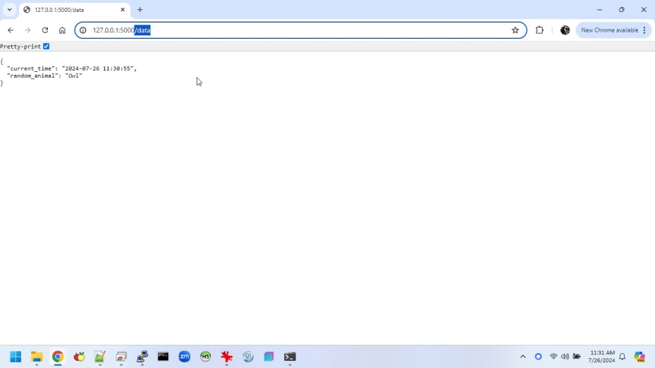 Now go http://127.0.0.1:5000/data in your browser and you'll see the data displayed in json format. Refresh the browser page, and you'll see an updated datetime value along with a different random animal name, each time you refresh.