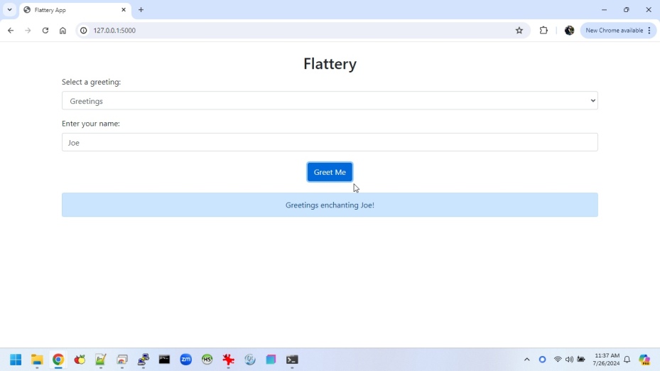 from flask import Flask, jsonify, request, send_from_directory from flask_cors import CORS import random app = Flask(__name__) CORS(app) # This will enable CORS for all routes flattering_words = ["dearest", "beautiful", "enchanting", "wonderful", "amazing", "gorgeous", "charming"] @app.route('/') def index(): return send_from_directory('.', 'flatter.html') @app.route('/greet', methods=['POST']) def greet(): data = request.get_json() name = data.get('name', 'World') greeting = data.get('greeting', 'Hello') flattering_word = random.choice(flattering_words) full_greeting = f"{greeting.capitalize()} {flattering_word} {name}!" return jsonify({"greeting": full_greeting}) if __name__ == '__main__': app.run()Save this front-end code to a file named 'flatter.html':