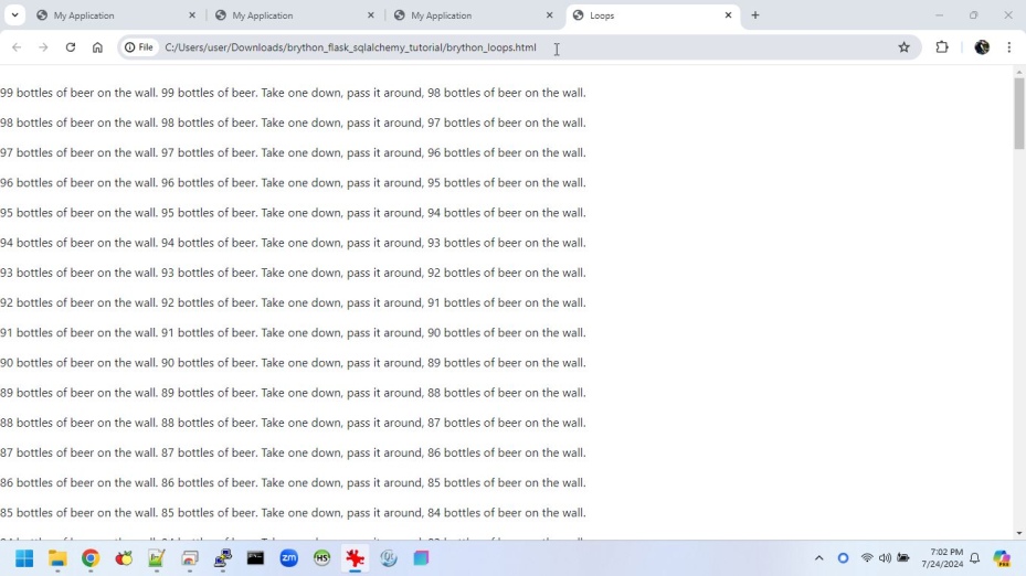 <!DOCTYPE html> <html lang="en"> <head> <meta charset="UTF-8"> <meta name="viewport" content="width=device-width, initial-scale=1.0"> <title>Loops</title> <link href="https://stackpath.bootstrapcdn.com/bootstrap/4.5.2/css/bootstrap.min.css" rel="stylesheet"> <script type="text/javascript" src="https://cdn.jsdelivr.net/npm/brython@3.11.0/brython.min.js"></script> <script type="text/javascript" src="https://cdn.jsdelivr.net/npm/brython@3.11.0/brython_stdlib.js"></script> </head> <body onload="brython()"> <div id="output" class="mt-4"></div> <script type="text/python"> from browser import document, html output = document["output"] for counter in range(99, 0, -1): output <= html.P( f"""{counter} bottles of beer on the wall. {counter} bottles of beer. Take one down, pass it around, {counter - 1} bottles of beer on the wall.""" ) </script> </body> </html>