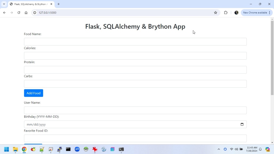 <!DOCTYPE html> <html lang="en"> <head> <meta charset="UTF-8"> <meta name="viewport" content="width=device-width, initial-scale=1.0"> <title>Flask, SQLAlchemy & Brython App</title> <link href="https://stackpath.bootstrapcdn.com/bootstrap/4.5.2/css/bootstrap.min.css" rel="stylesheet"> <script type="text/javascript" src="https://cdn.jsdelivr.net/npm/brython@3.11.0/brython.min.js"></script> <script type="text/javascript" src="https://cdn.jsdelivr.net/npm/brython@3.11.0/brython_stdlib.js"></script> </head> <body onload="brython()"> <div class="container mt-4"> <h2 class="text-center">Flask, SQLAlchemy & Brython App</h2> <div class="form-group"> <label for="food-name">Food Name:</label> <input type="text" id="food-name" class="form-control"> <label for="food-calories">Calories:</label> <input type="number" id="food-calories" class="form-control"> <label for="food-protein">Protein:</label> <input type="number" id="food-protein" class="form-control"> <label for="food-carbs">Carbs:</label> <input type="number" id="food-carbs" class="form-control"> <button id="add-food-button" class="btn btn-primary mt-2">Add Food</button> </div> <div class="form-group"> <label for="user-name">User Name:</label> <input type="text" id="user-name" class="form-control"> <label for="user-birthday">Birthday (YYYY-MM-DD):</label> <input type="date" id="user-birthday" class="form-control"> <label for="user-favorite-food">Favorite Food ID:</label> <input type="number" id="user-favorite-food" class="form-control"> <button id="add-user-button" class="btn btn-primary mt-2">Add User</button> </div> <div class="form-group"> <button id="get-foods-button" class="btn btn-secondary mt-2">Get All Foods</button> </div> <div class="form-group"> <label for="user-filters">Filters (e.g., {"name": "John Doe"}):</label> <input type="text" id="user-filters" class="form-control"> <label for="user-sort-by">Sort By:</label> <input type="text" id="user-sort-by" class="form-control"> <label for="user-limit">Limit:</label> <input type="number" id="user-limit" class="form-control"> <button id="get-users-button" class="btn btn-secondary mt-2">Get Users</button> </div> <div id="output" class="mt-4"></div> </div> <script type="text/python"> from browser import document, ajax, window def display_result(data): output_div = document['output'] output_div.innerHTML = '<pre>' + data + '</pre>' def add_food(event): name = document['food-name'].value calories = document['food-calories'].value protein = document['food-protein'].value carbs = document['food-carbs'].value data = { 'name': name, 'calories': calories, 'protein': protein, 'carbs': carbs } ajax.post('/foods', data=window.JSON.stringify(data), headers={'Content-Type': 'application/json'}, oncomplete=lambda req: display_result(req.text)) def add_user(event): name = document['user-name'].value birthday = document['user-birthday'].value favorite_food = document['user-favorite-food'].value data = { 'name': name, 'birthday': birthday, 'favorite_food': favorite_food } ajax.post('/users', data=window.JSON.stringify(data), headers={'Content-Type': 'application/json'}, oncomplete=lambda req: display_result(req.text)) def get_foods(event): ajax.get('/foods', oncomplete=lambda req: display_result(req.text)) def get_users(event): filters = document['user-filters'].value sort_by = document['user-sort-by'].value limit = document['user-limit'].value params = { 'filters': filters, 'sort_by': sort_by, 'limit': limit } query_string = '&'.join([f'{key}={value}' for key, value in params.items() if value]) url = '/users?' + query_string ajax.get(url, oncomplete=lambda req: display_result(req.text)) document['add-food-button'].bind('click', add_food) document['add-user-button'].bind('click', add_user) document['get-foods-button'].bind('click', get_foods) document['get-users-button'].bind('click', get_users) </script> </body> </html>Run the app by typing 'python sqlalchemy_flask.py' at your command line, and open your browser to http://127.0.0.1:5000